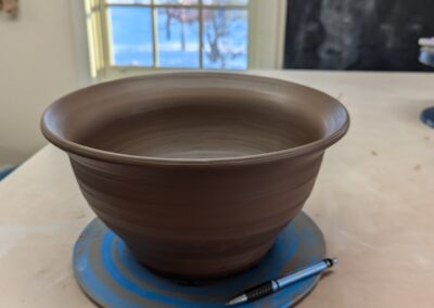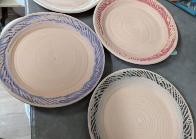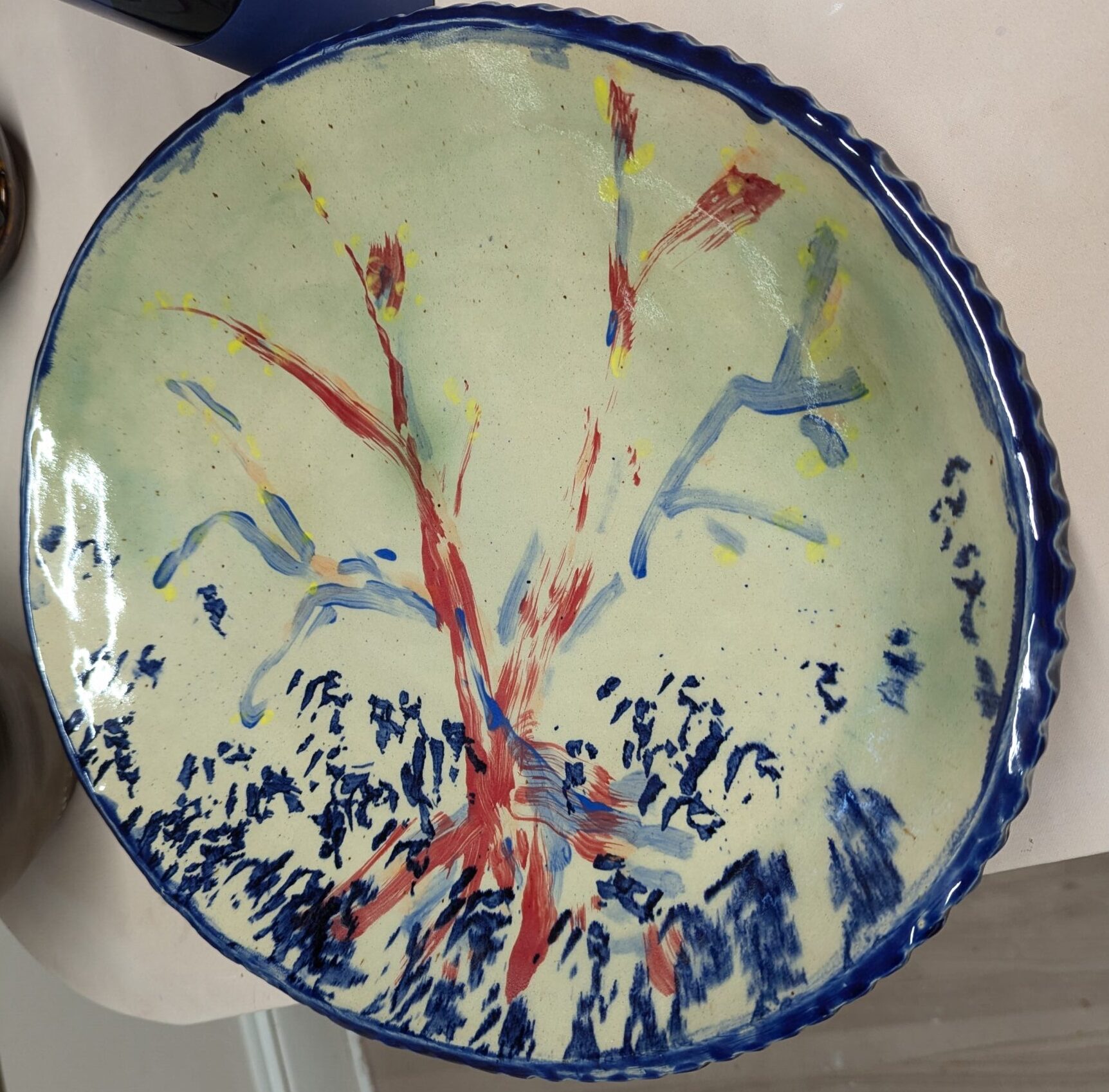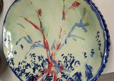 Hand built platter, cone 6 reclaim clay, 21 x 3″, interior Sues Clear